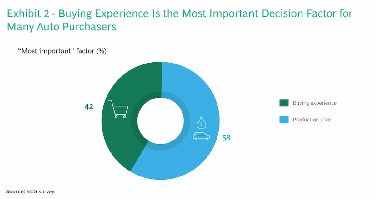 The same BCG research found that 42% of new car buyers said the purchasing experience was the most important factor in buying a new car, versus 58% who prioritized product or price: