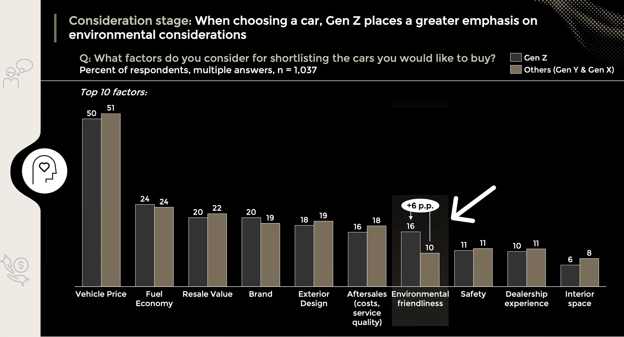 Among those specifically interested in fully electric vehicles, 35% of Gen Z and 18% of other cohorts mentioned environmental reasons (the average across all ages being 24%).