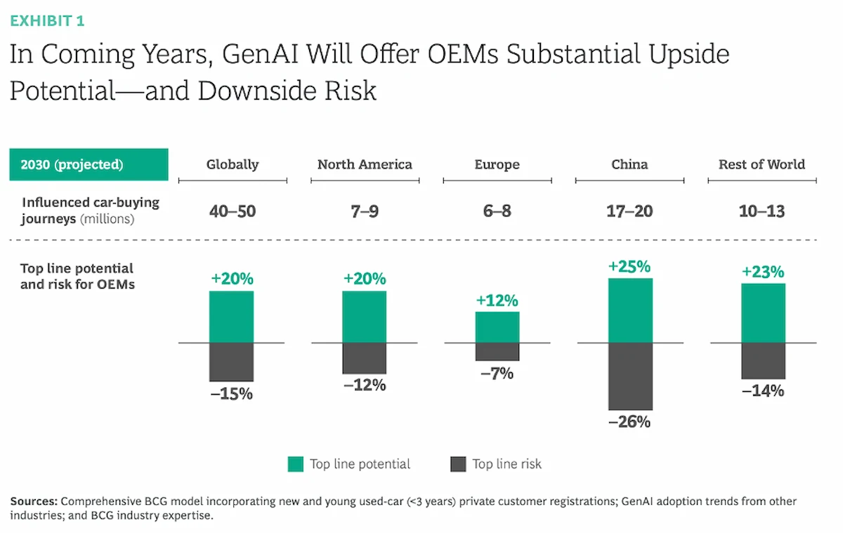 What's intriguing are BCG's estimates regarding Gen AI's potential impact on OEMs' revenues. Let's think about the logic here: Gen AI supposedly helps customers configure cars better, which should matter most where configuration complexity is highest—that's Europe. Europe also has the highest brand loyalty, which should theoretically make upselling customers to better configurations easier, since they've already decided on the brand. Plus, it's in Europe where price discrepancies for the same vehicle model between dealers can be relatively high therefore giving an opportunity for new technologies to help customers find the best deal therefore eliminating that last friction. These factors should amplify Gen AI's impact, not diminish it. Yet BCG projects the smallest Gen AI impact in the region where their own logic mostly indicates it should matter most.