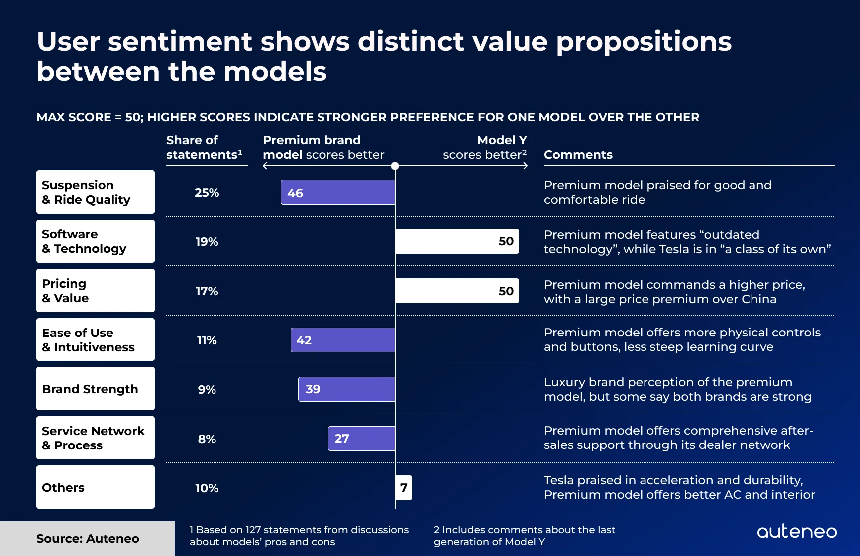 Amplify the Advantages. Premium brands must double down on their strengths—the areas where new competitors often fall behind. While new entrants talk about infotainment and acceleration, legacy brands can highlight the superior ride quality from decades of suspension tuning, the peace of mind offered by an extensive and reliable service network, or the tactile quality of a meticulously crafted interior. As shown earlier in the user sentiment chart (Figure 1), these are the attributes that consumers identify online as those where premium brands hold an advantage.